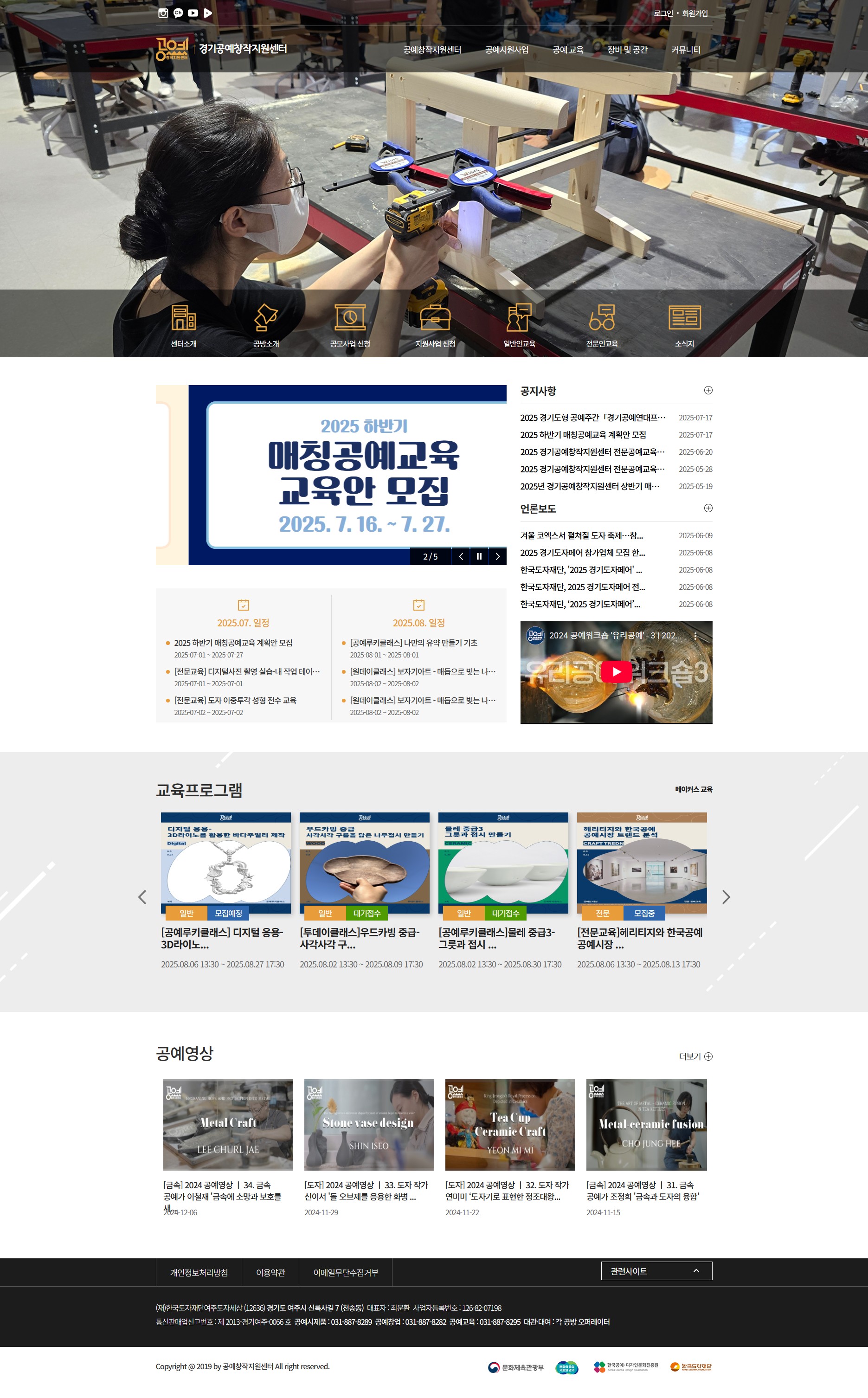 경기공예창작지원센터 홈페이지 시안은 공예 실습과 교육 중심 콘텐츠를 역동적으로 전달하기 위해 실제 교육 현장을 메인 비주얼로 활용하여 몰입감을 높인 것이 특징입니다. 주요 메뉴는 아이콘 기반으로 하단에 고정 배치해 사용자 이동 동선을 직관적으로 구성했으며, 공지사항과 교육일정은 슬라이드와 리스트형으로 정보 접근성과 최신성 모두를 고려해 설계되었습니다. 하단 교육프로그램과 공예영상 섹션은 카드형 콘텐츠로 정리되어 시각적 정돈감과 탐색 편의성을 제공하며, 전체적으로 실습 기반의 체험형 콘텐츠에 최적화된 기능성과 전달력을 갖춘 구조입니다.